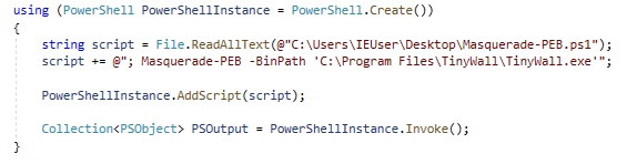 即使我们可以将PowerShell代码移植成C#代码,但我们还是偷了个懒,在C#版的Exploit.exe中直接导入System.Management.Automation.dll。我们创建了一个PowerShell实例,读取经过修改的Masquerade-PEB.ps1,然后调用相应代码,希望能够成功伪造Exploit.exe的PEB元素。