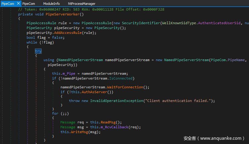 首先我们来看一下命名管道的创建及使用过程。当TinyWall启动时,会调用PipeServerWorker方法完成命名管道创建操作。Windows提供了一个API:System.IO.Pipes.NamedPipeServerStream,其中某个构造函数以System.IO.Pipes.PipeSecurity作为参数,这样用户就能使用SecurityIdentifiers等类,通过System.IO.PipeAccessRule对象实现细粒度的访问控制。此外,从上图中我们可以观察到,这里唯一的限制条件在于客户端进程必须在已认证用户上下文中运行,但这看上去似乎并不是一个硬性限制。