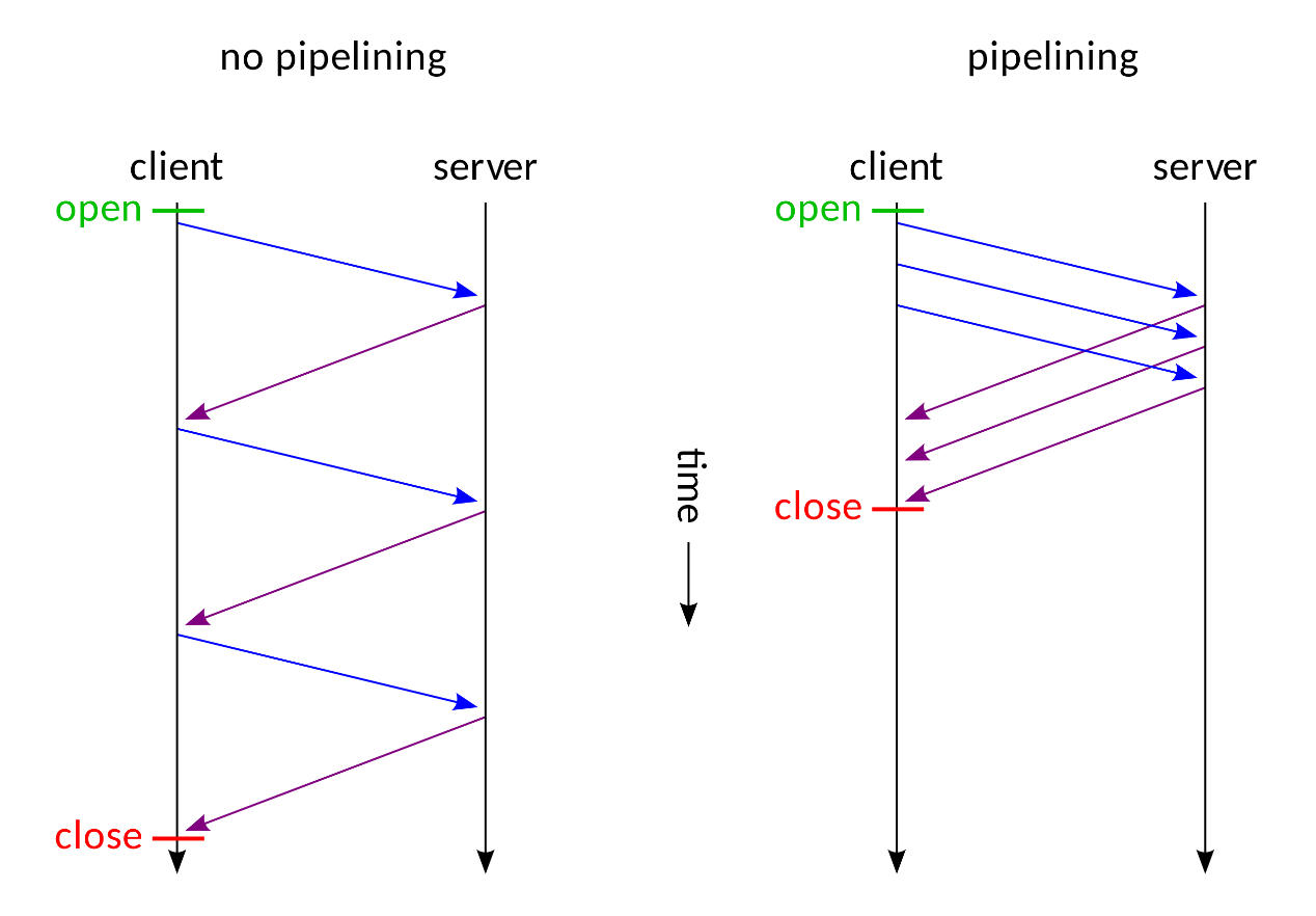 在HTTP1.1后,增加了一个特殊的请求头Connection: Keep-Alive,建立tcp持续通道,进行一次tcp握手,就能传送多个请求。但这样子只能是请求一次响应一次。为了提高数据传输的效率,减少阻塞。后来就有了HTTP Pipelining(管线化)字段,它是将多个http请求批量提交,而不用等收到响应再提交的异步技术。如下图就是使用Pipelining和非Pipelining