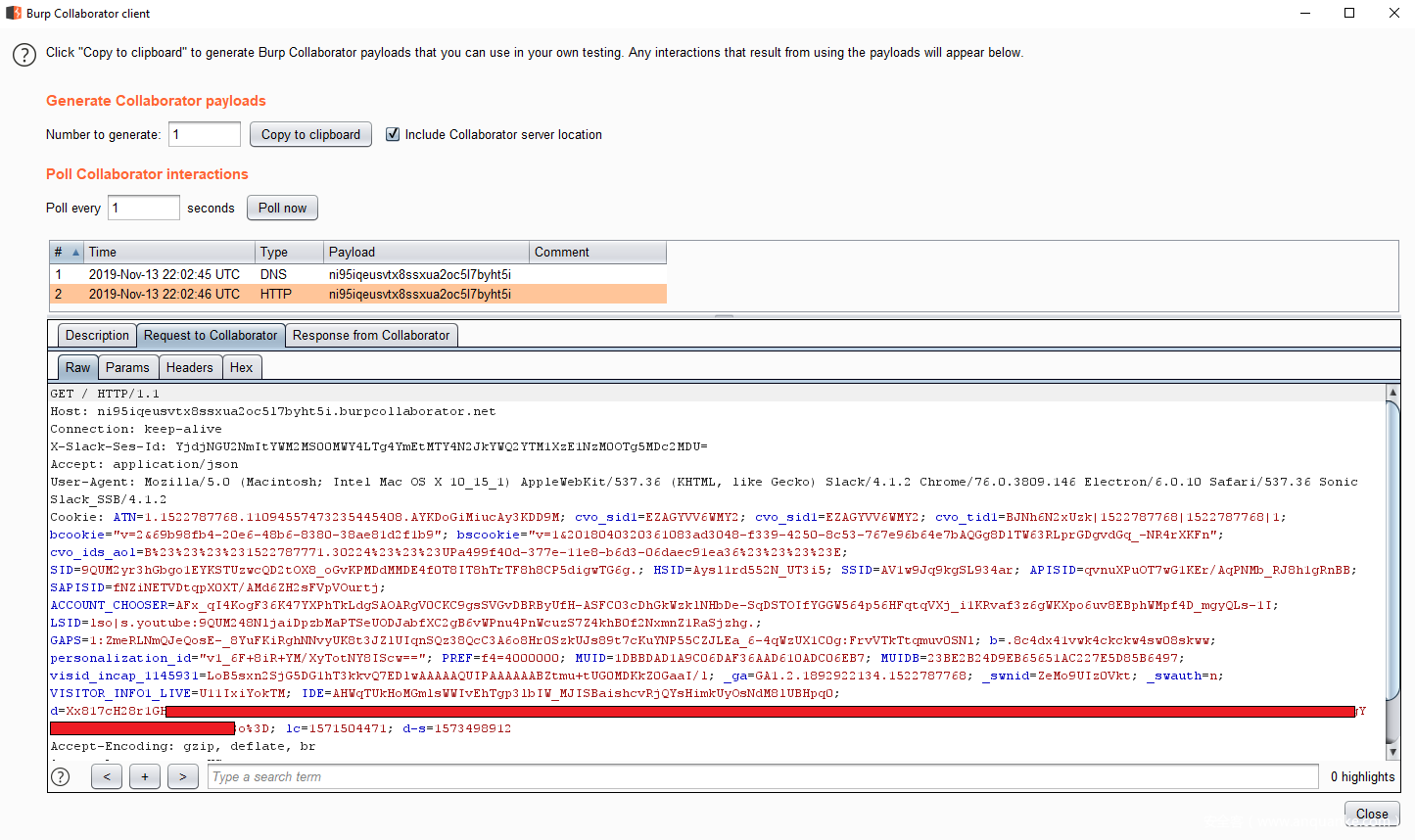 在Burp Collaborator Client上能成功窃取到用户的cookie