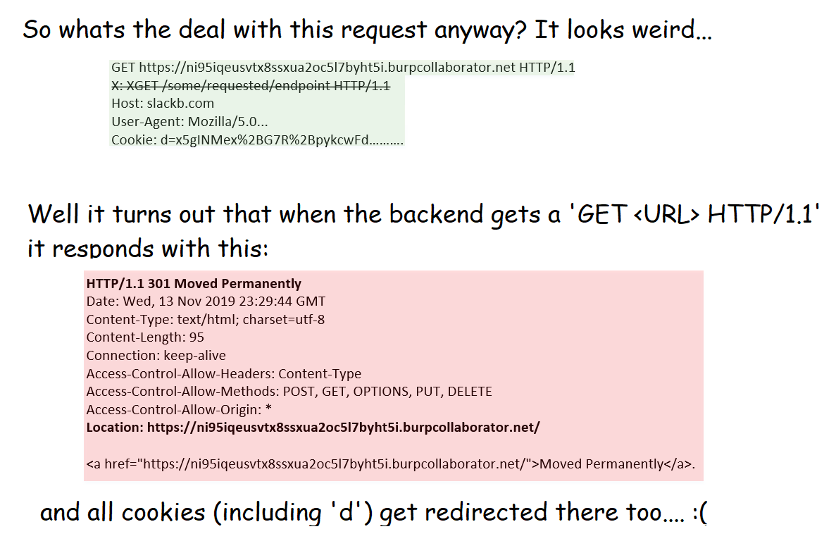 可见用户的正常请求被拼接到X字段,而X请求头非标准请求头,故忽略,而该用户的cookie字段也被拼接到了该走私的请求上