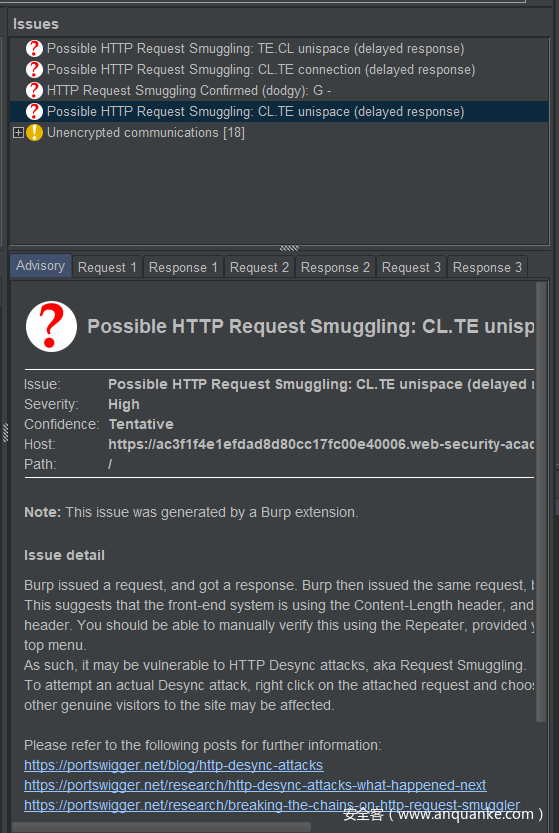 在burpsuite上查找到请求包,右键lauch smuggle probe,随后在burpsuite的扫描结果上显示报告