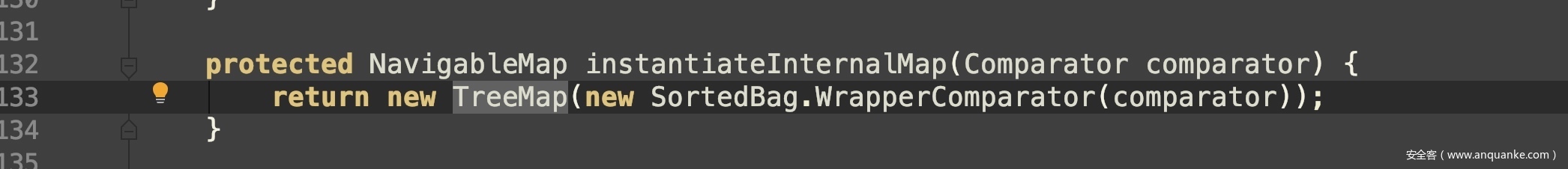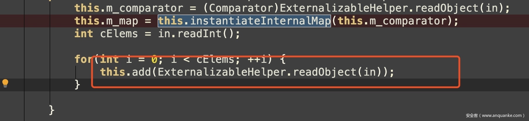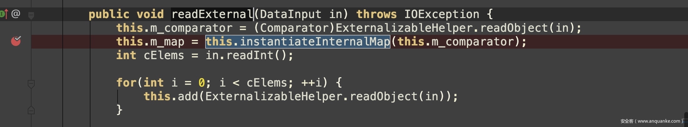 跟进instantiateInternalMap方法,创建了TreeMap对象,其comparator属性值为传入的this.m_comparator参数,同时攻击者可以构造输入流in来赋值this.m_comparator参数
