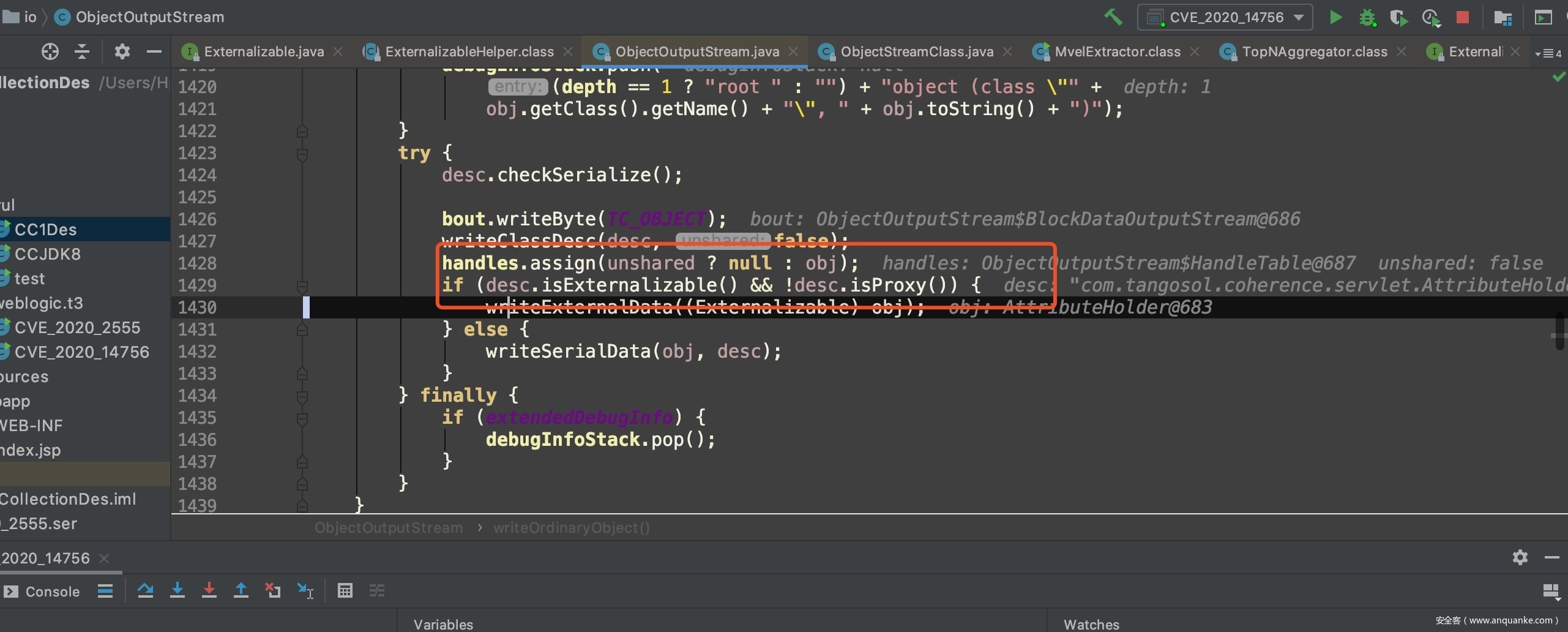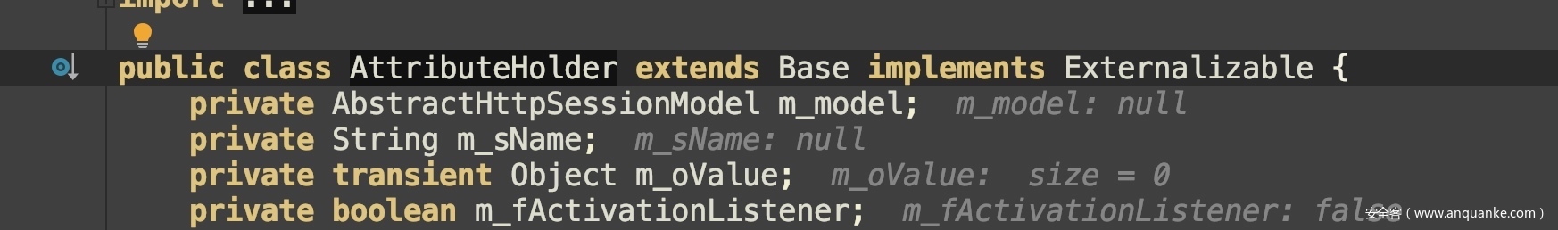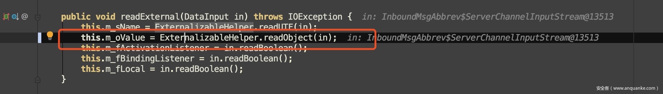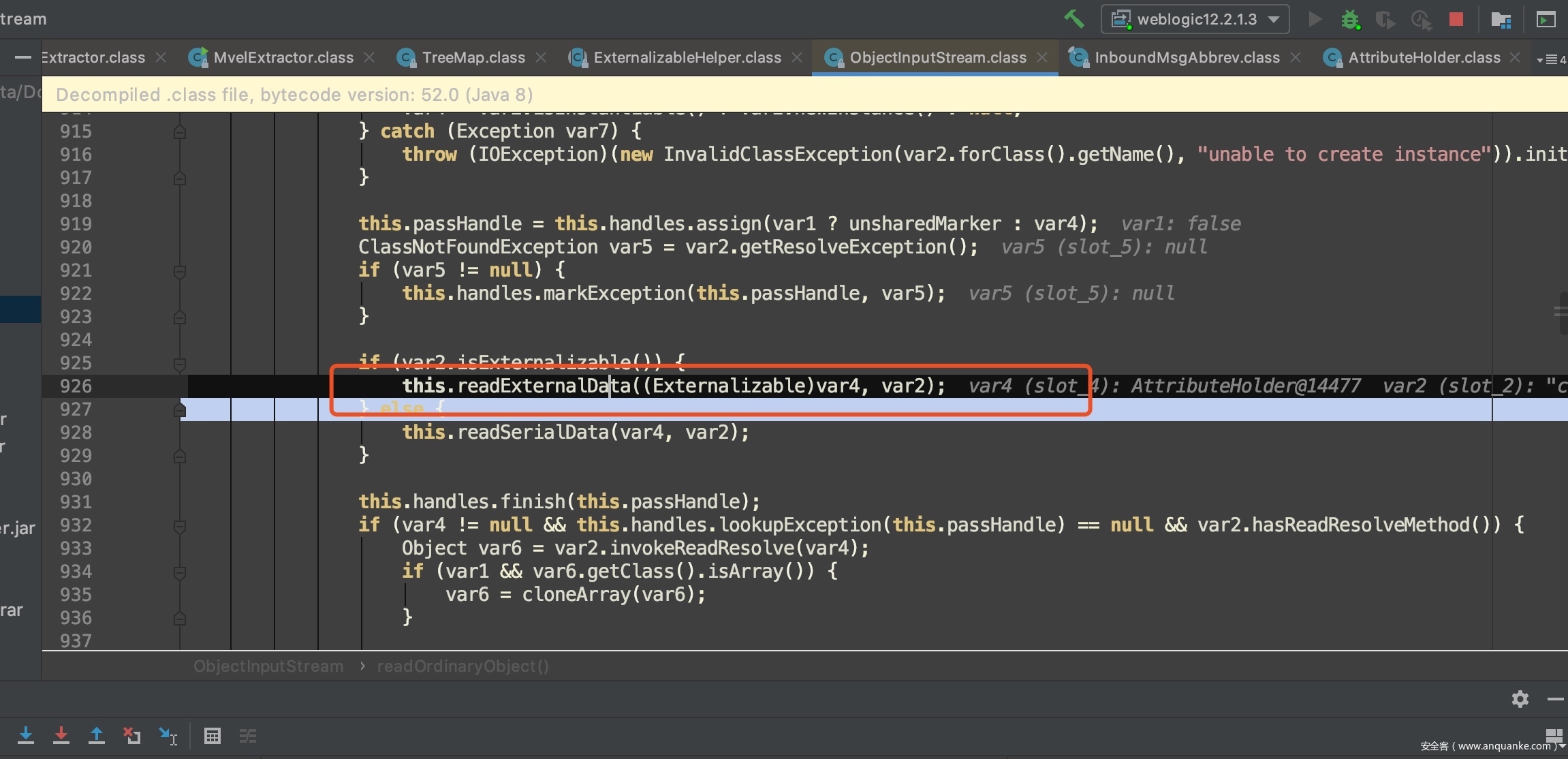 如果实现了Externalizable或者ExternalizableLite接口,会调用实例自身的readExternal方法,这是一个自定义反序列化操作。这个漏洞所利用的类(AttributeHolder、PartialResult、MvelExtractor)都实现了Externalizable或者ExternalizableLite接口