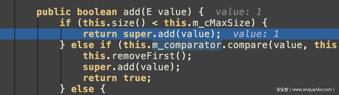 所以只需要往TreeMap里加个键值对就可以执行this.add方法。跟进this.add,调用super.add(value)
