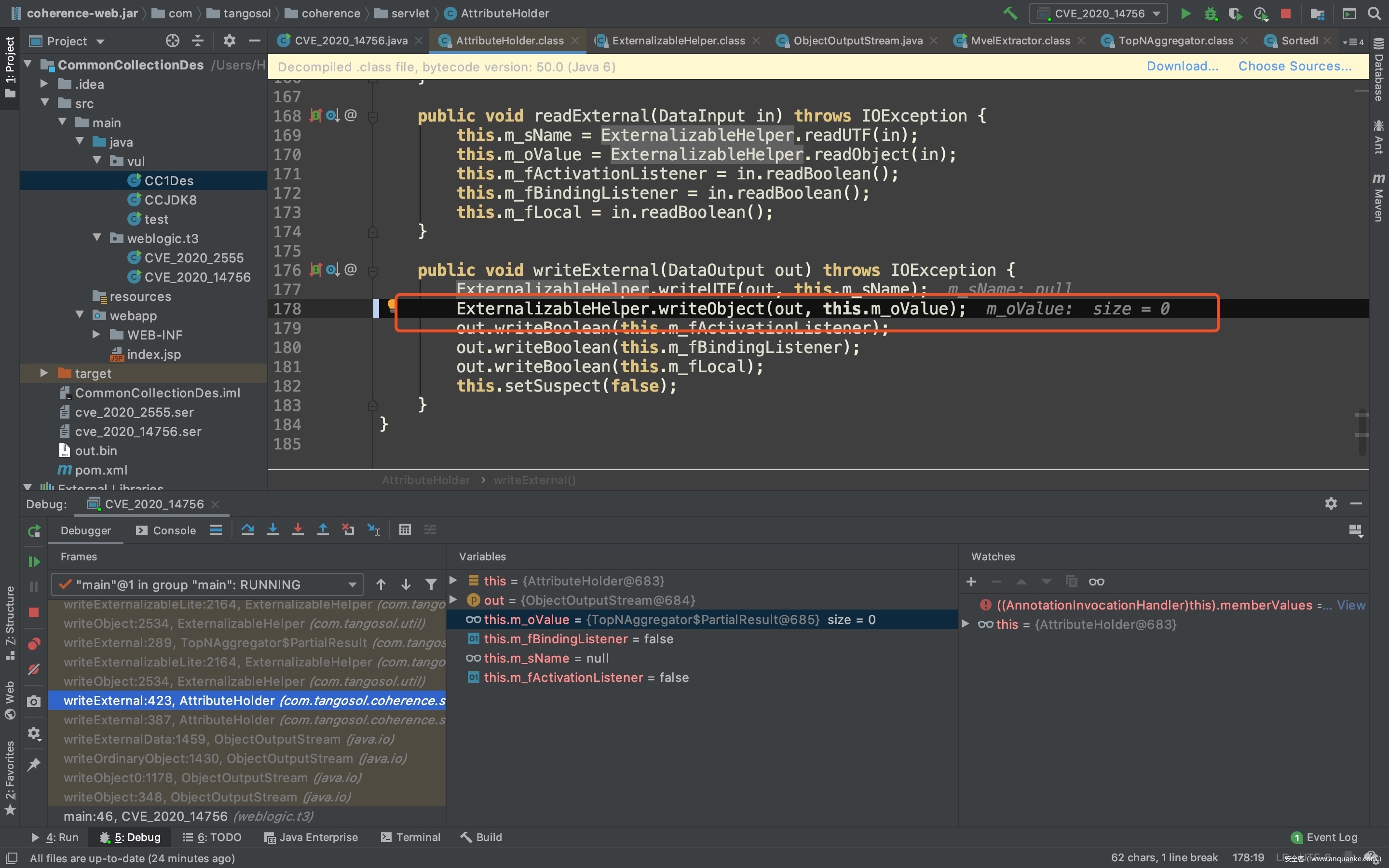 作者选择的是com.tangosol.coherence.servlet.AttributeHolder,由于AttributeHolder实现了Externalizable接口,因此在反序列化的时候步入readExternalData来处理输入流。