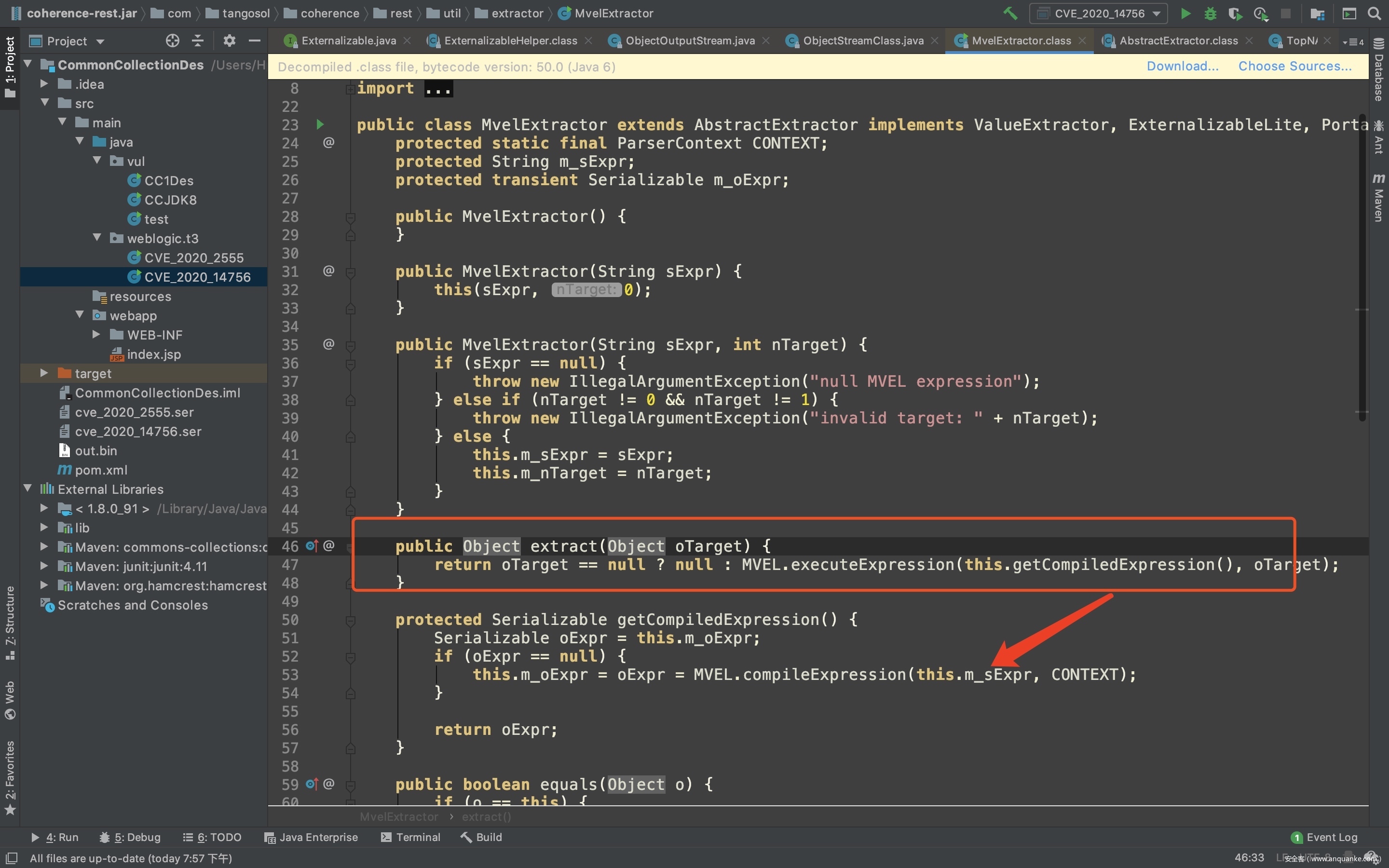 通过com.tangosol.coherence.rest.util.extractor.MvelExtractor父类com.tangosol.coherence.rest.util.extractor.AbstractExtractor中的compare方法调用自身extract方法