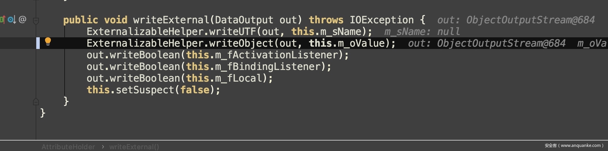 在序列化的过程先解析第一个对象AttributeHolder,进入判断执行writeExternalData