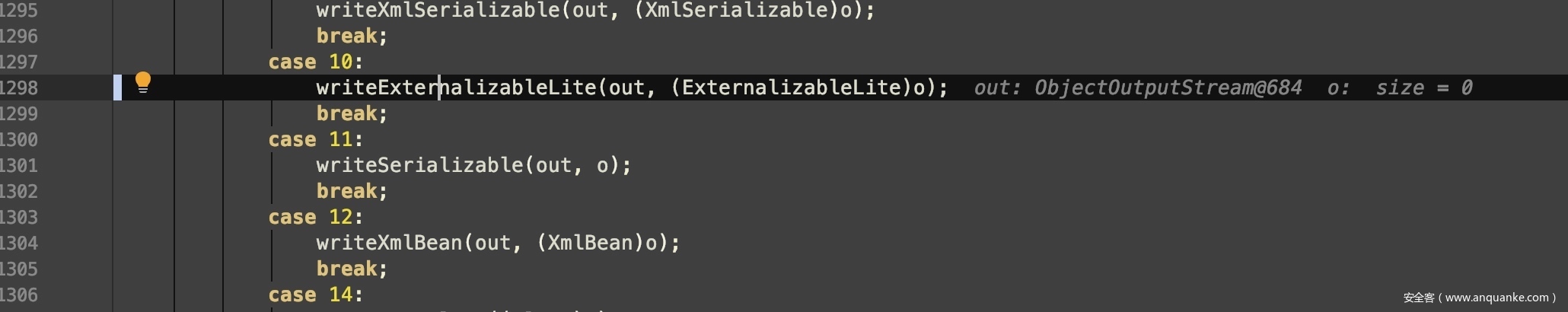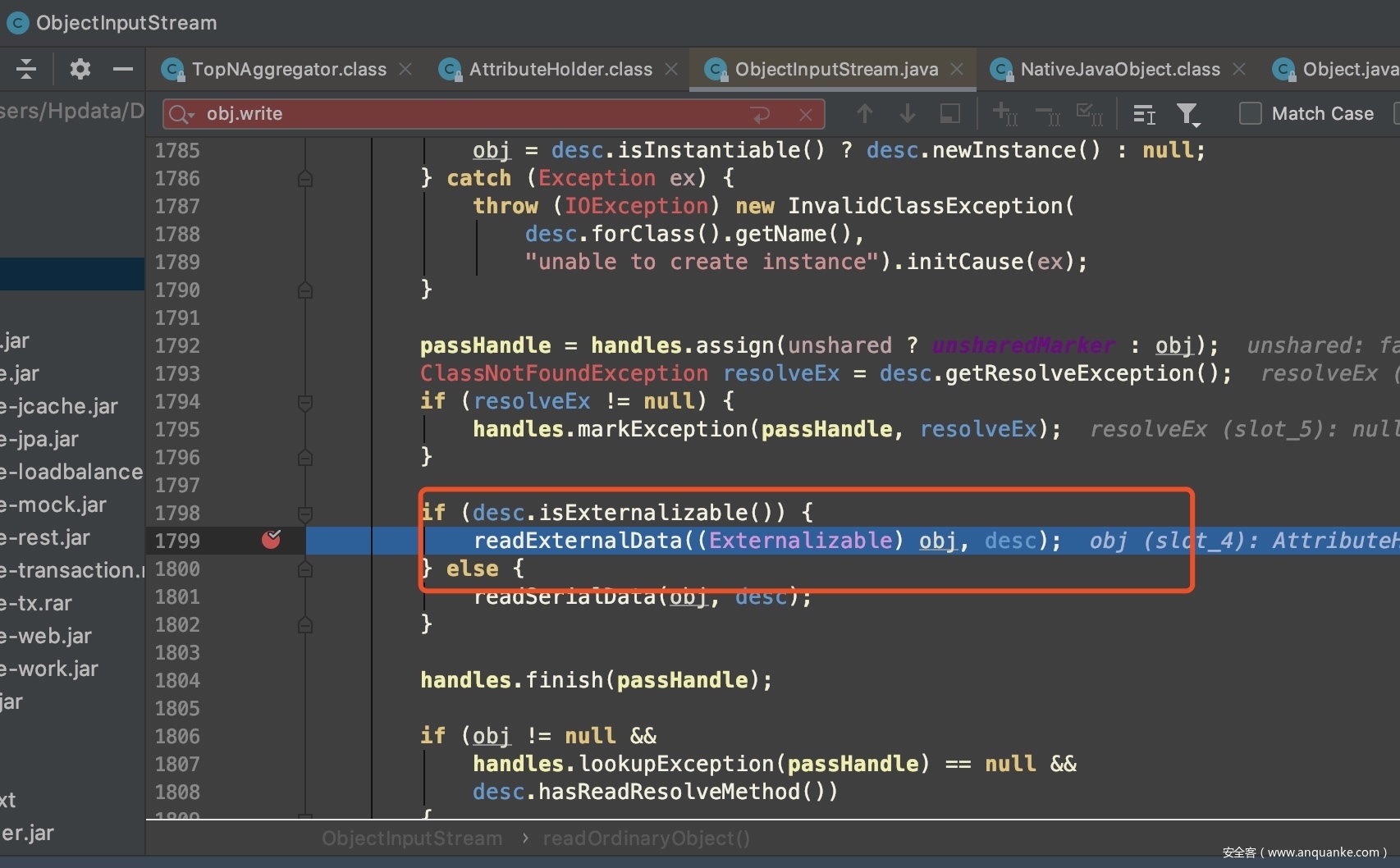 由于第一个类AttributeHodler不在黑名单中,且其反序列化操作为readExternalData,主要作用是循环递归ExternalizableLite接口自定义的反序列化操作