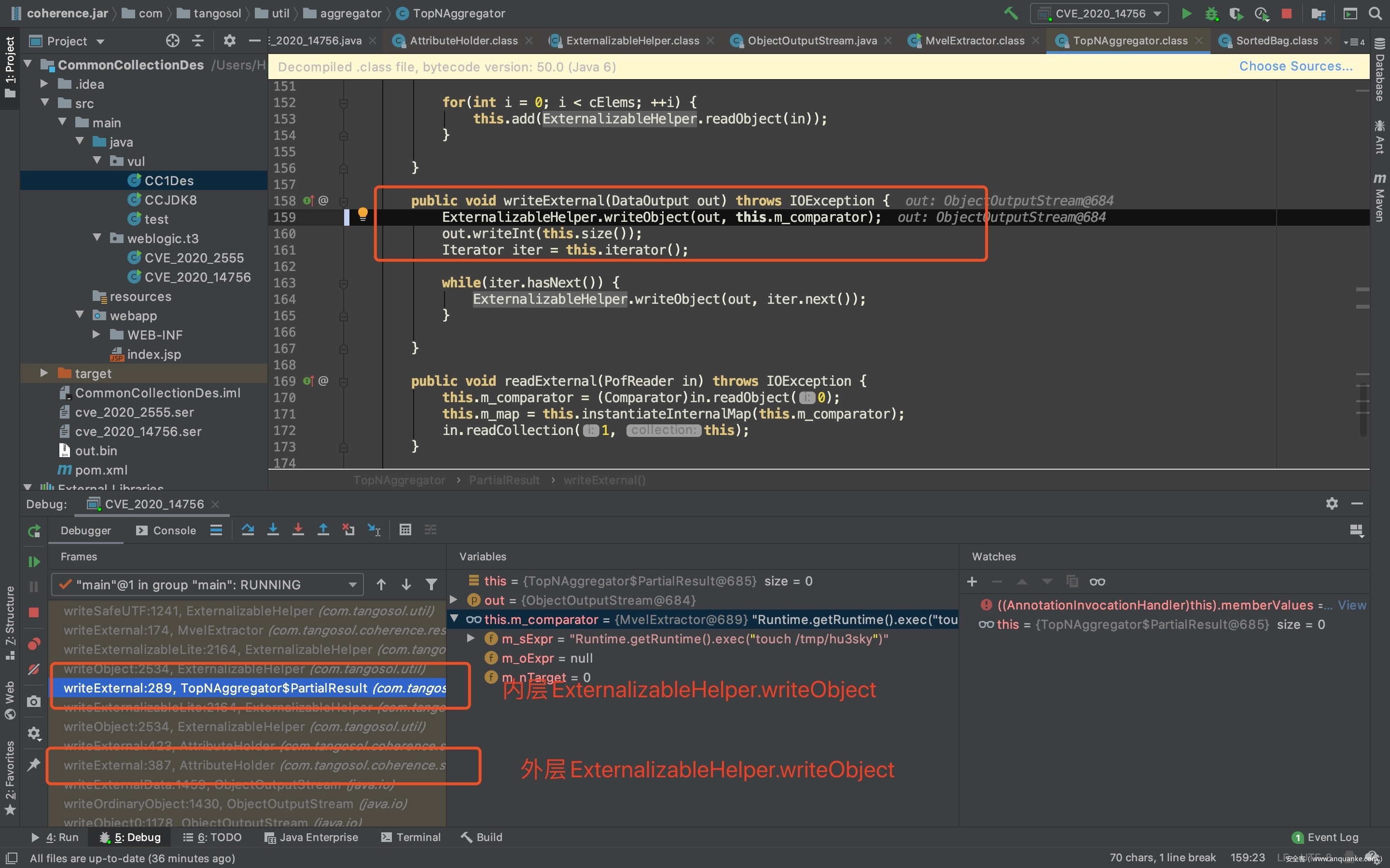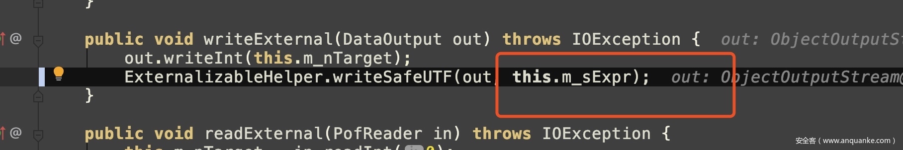 步入ExternalizableHelper.writeObject(out, this.m_comparator),判断this.m_comparator也就是MvelExtractor也是实现了ExternalizableLite的类,继而再次递归调用MvelExtractor#writeExternal,把this.m_sExpr写入输出流