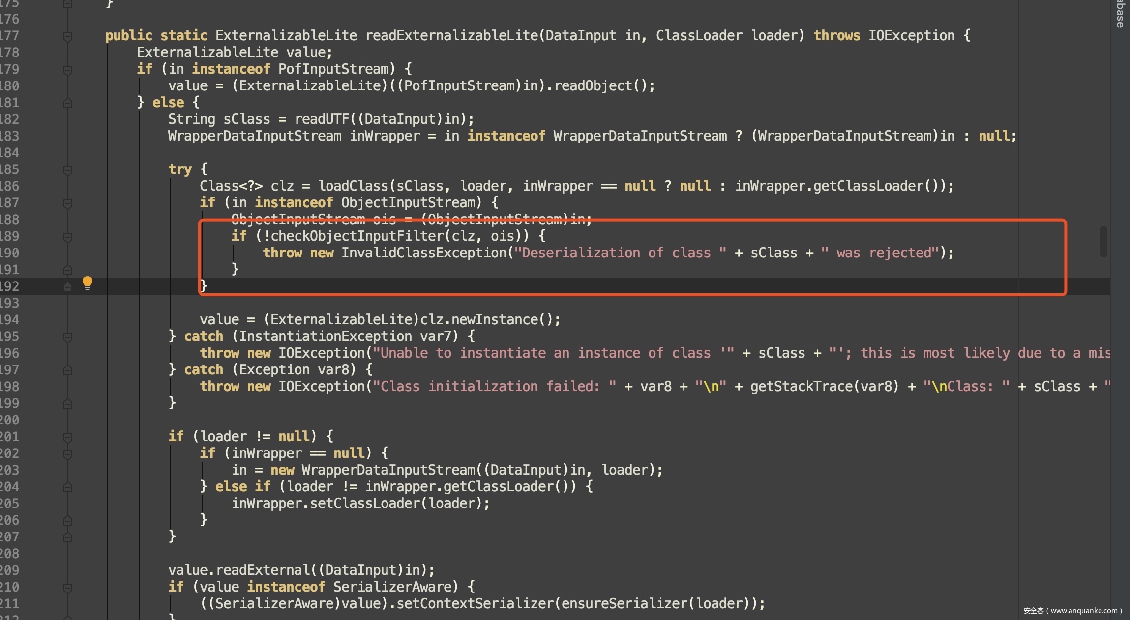 coherence.jar补丁中,在readExternalizableLite方法中对反序列化的数据流调用ObjectFilter进行检测
