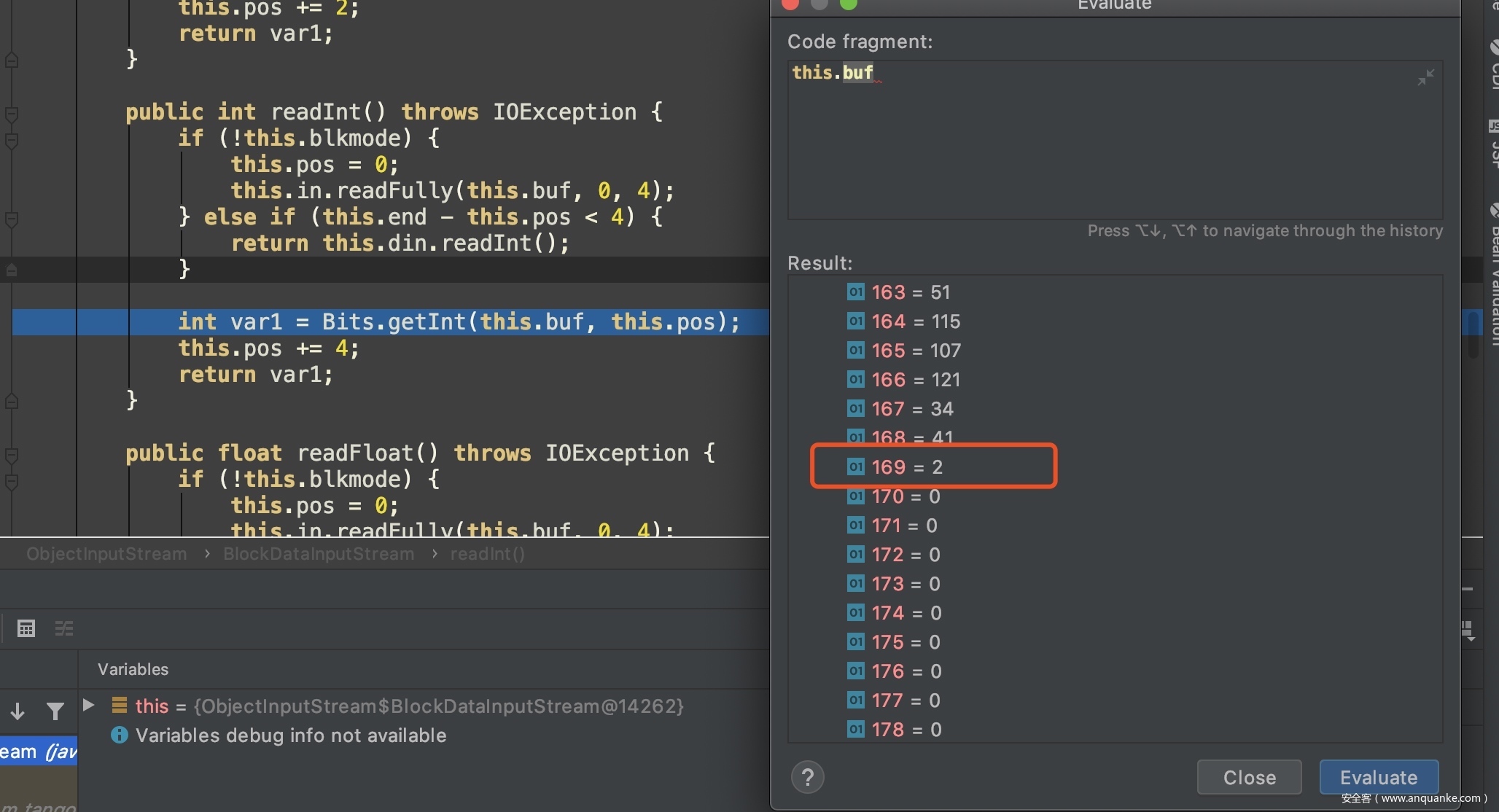 但步入this.add函数之前,还需令cElems不为0,否则直接跳出循环。在追进in.readInt()的过程中发现,如果仅在PartialResult实例中写入m_comparator和m_cMaxSize两个数据流,那么in.readInt();获取的值为0,因为已经获取完PartialResult里的所有数据了。例如我们在序列化是令m_cMaxSize=2,则把PartialResult数据流读取到的buffer数据中后,最后一个值指向m_cMaxSize的值:2