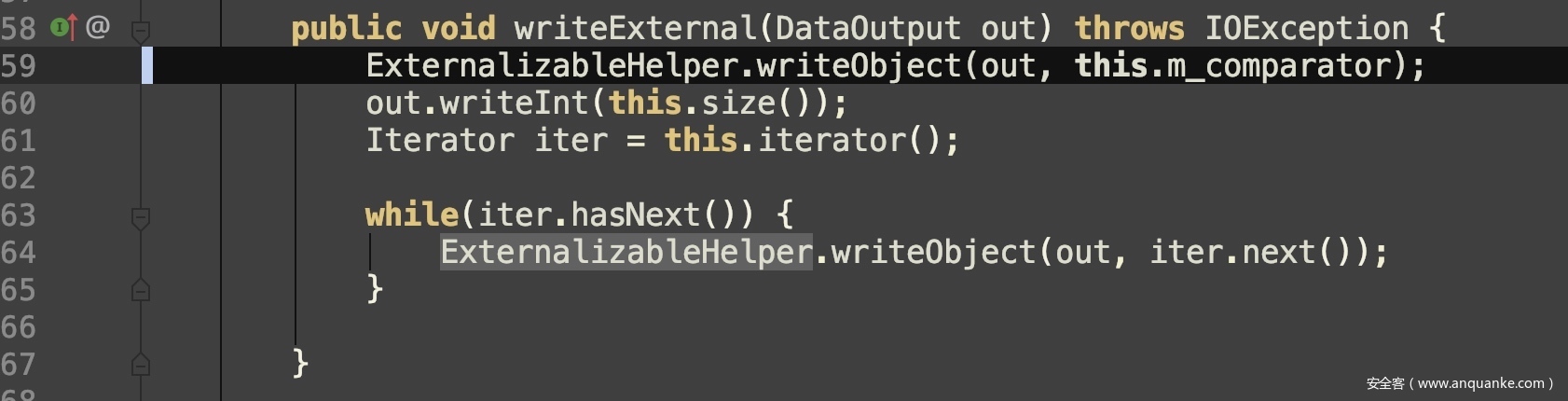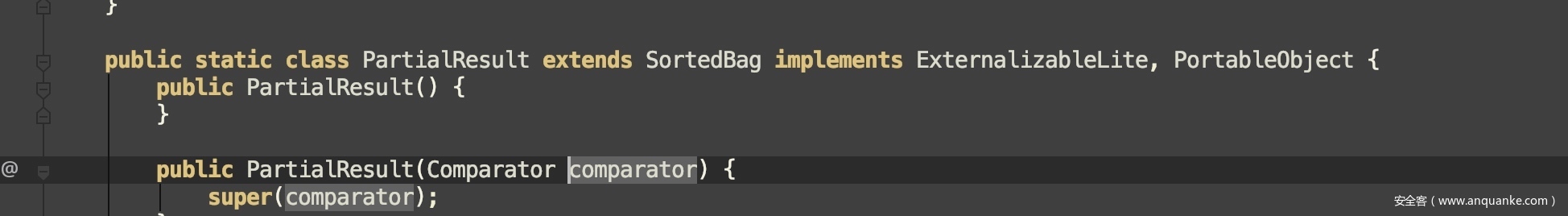 PartialResult#writeExternal()会调用ExternalizableHelper.writeObject(out, this.m_comparator)继续向输出流写入PartialResult内部属性m_comparator,这就帮我们解决了问题。我们只需创建实例后令PartialResult.m_comparator=new MvelExtractor(xxx);