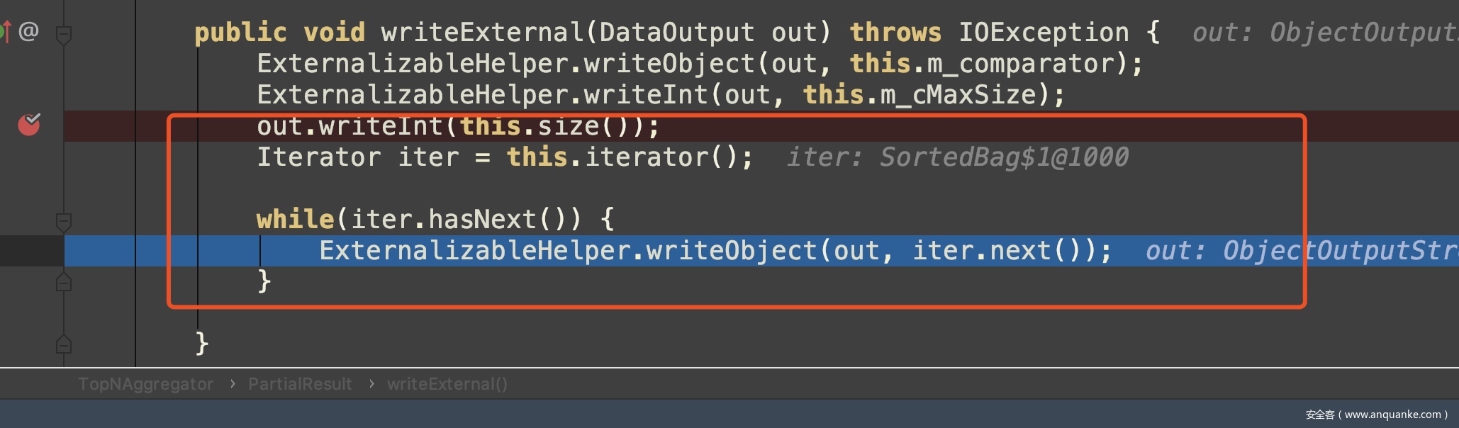 再例如TopNAggregator.PartialResult也重写了自己的writeExternal,将内部变量this.m_comparator写入序列化的输出流