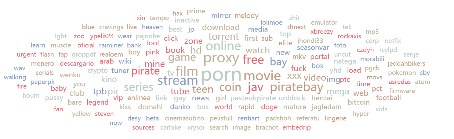 在 Alexa Top30万 的站点中,通过验证他们的首页,我们可以确认当前有至少 628 个网站挂载了挖矿代码。我们把这些域名绘制了标签图如下,读者可以有一个直观印象。由于色情相关的特殊性,我们不会公布这些已知域名。