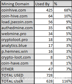 值得一提的是,上表中尽管所有的挖矿网站被使用了728次,但所有的内容网站加起来只有 628 个,这是因为部分内容网站使用了 2 个或者更多的挖矿网站。在这个市场里,这是一种普遍的情况。