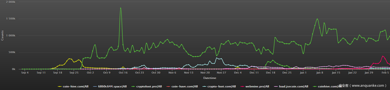 - 市场开启于 2017-09,coin-hive.com 和 coinhive.com 先后于 2017-09-15 和 2017-09-28 开始有大量访问