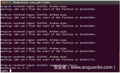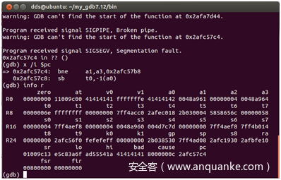 为了能够远程调试httpd进程,需要将编译生成的运行于mips平台下的gdbserver复制进路由器中。使用网线将笔记本与路由器相连,保证虚拟机与路由器能够ping通。在虚拟机中打开shell,将路径切换到gdbserver所在目录,然后执行“python -m SimpleHTTPServer 80”即可打开一个简单的http环境,在路由器shell中切换到/data目录,然后执行“wget http://虚拟机ip/gdbserver”即可将gdbserver下载到/data目录中。从上图可以看到,其存在两个httpd进程,pid分别是356和348,通过执行样本前后top命令结果变化,发现崩溃的是pid为356的进程。故在路由器shell中执行“./gdbserver 192.168.1.1:4444 –attach 356”(192.168.1.1是路由器ip地址),然后在虚拟机shell中执行“./mipsel-linux-gdb”(这是我编译生成的gdb的名称),再执行“target remote 192.168.1.1:4444”,若一切正常,即可连接成功并中断下来,效果如下图所示。在调试过程中,经常由于“SIGPIPE”信号中断,为了去除该信号的干扰,可在gdb中首先执行”handle SIGPIPE nostop print”即可,然后输入“c”回车让程序继续执行。