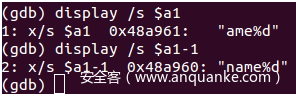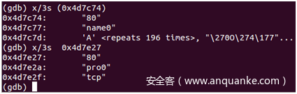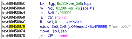 该漏洞需要获得管理员的session id方能利用,故不能直接远程利用,可考虑结合XSS漏洞等一起实现远程对路由器的控制等。分析了一下发生溢出时的函数调用,位于httpd地址0x457f3c处的sprinf调用,此时,函数参数分别为a0=0x7fea20f0(=$sp+0x160),a1指向”%s,%s,%s,%s,%s,%s”字符串,a2=0x4d7c74,a3=0x4d7e27,查看a2、a3相关内容如下图所示。