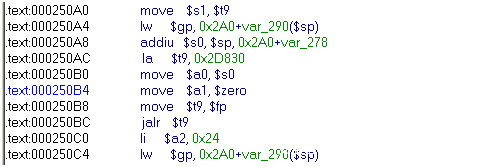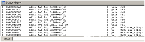 下面我们展示一下利用该漏洞实现路由器重启,首先ida加载libc.so,发现system函数的相对虚拟地址为 0x4c7e0,转换为内存地址为0x2afe47e0,重启的命令为“reboot”,故调用时需要将“reboot”字符串写入栈上,并将其地址写入a0寄存器中。在ida中执行“mips rop gadgets”选项,使该插件(插件安装方式可见《揭秘家用路由器…》一书52页)初始化,然后在ida下方文本框中输入命令“mipsrop.stackfinders()”,显示libc.so中所有把堆栈数据放入寄存器的命令,部分结果如下图所示。