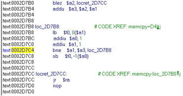 可以看出,该地址位于memcpy函数中,根据mips函数调用的传参规则,可知a0,a1,a2三个寄存器为memcpy调用的三个参数,查看a1地址对应的字符串,如下图所示。
