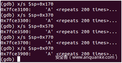 从前面图中0x458060处指令可以看出,a0寄存器的值来自于($sp+0x280-0x40),仔细检查$sp上面的值,最终可以发现从地址($sp+0x170)处覆盖为poc.py中的“AAAA”1000,如下图所示。
