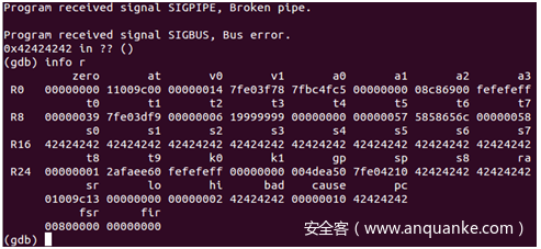 重新启动路由器,打开gdbserver,并将gdb连接到gdbserver上,登录路由器管理界面,将session id 记录下,修改poc.py中session id的值,并将溢出字符串修改为图16中的值,重新执行“Python poc.py”,结果如图17所示。可以看到,成功将pc寄存器覆盖为0x42424242(即“BBBB”)。