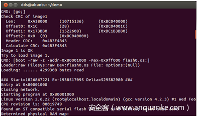 然后命令行执行“sudo minicom -s”,将串口设备设置为“ttyACM0”,保存并退出(其他数据如速率、校验方式等一般不用修改,若下面连接不成功再修改相关参数)。再在命令行执行“sudo minicom”,变为等待连接窗口,将路由器上电开启,正常情况下,该窗口中将出现路由器的启动信息,部分内容如下图所示。