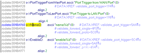 在ida下加载httpd程序(位于前面固件提取目录/usr/sbin下),查看字符串窗口,查找“name%d”字符串,结果如下图所示。