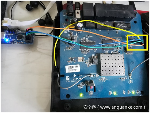 首先,拆开RV110W,发现其串口接口直接有标示,利用电烙铁焊接后,效果如下图所示。图中黄色圈中部分即为焊接的UART接口。