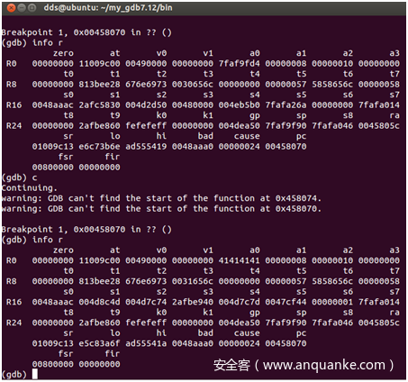 “b 0x458070”下断点,然后继续登录路由器管理界面,将session id 记录下,修改poc.py中session id的值,重新执行“Python poc.py”,中断在断点处,查看寄存器的值,a0不等于0x41414141,继续执行,再次中断于断点,查看寄存器的值,a0的值为0x41414141,如下图所示。
