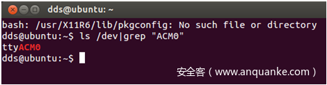 将导出的数据线连接到U转串工具上,只需连接GND、RX、TX三个即可,注意路由器的RX线和U转串工具的TX线相连,路由器的TX线和U转串工具的RX线相连,然后将U转串工具插入到笔记本的usb接口上,让其连接到Ubuntu虚拟机中,如下图中发现“ttyACM0”,说明已正常连接。