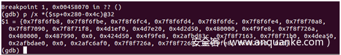 而前面a0的值来自地址($sp+0x280-0x40),显然在此范围内,从而造成后面执行memcpy时出现错误,下一步就是研究如何控制pc的值。观察图12中从0x458060开始一直到0x458294处的”jr ra”指令(同时可发现ra的值来自于*($sp+x0280-4),显然可以通过覆盖控制ra的值),这中间的指令多次调用了snprintf函数,并多次利用了($sp+0x170)以上空间的值,分别为var_3c、var_40、var_4c、var_48、var 40、var_44、var_30、var_38,故溢出时尽量不重写这些位置的值(另一种思路是研究如何设定溢出覆盖的值,让程序提前跳转到结束位置,这里我采用了比较笨的方法,但后面利用时发现可行),在正常中断于0x458070地址时,查看这些位置的值,如下图所示。