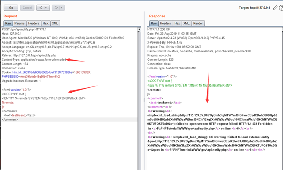 需要说明的是,XXE漏洞的利用对Libxml的版本是有要求的,在小于等于2.8.0版本下是容易产生该漏洞。而使用类似phpstudy这种集成环境建站时,应该注意使用的PHP版本,上述漏洞在5.4版本利用成功,5.6版本的并未成功。