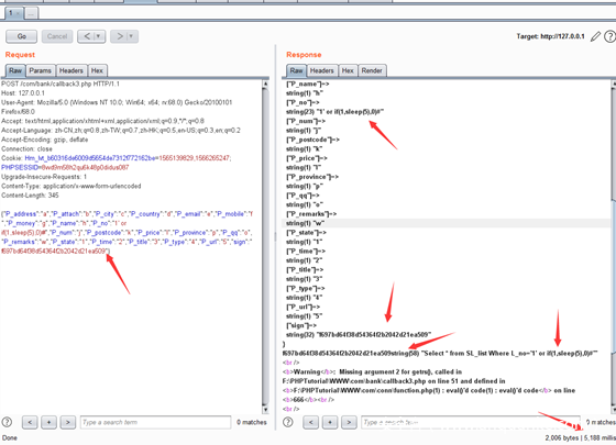 为了进入SQL语句,需要满足各个参数拼接之后的MD5值和我们传入的sign是一样的,这个问题很好解决。。直接把这个值打印出来,然后再修改sign发送数据包即可(当然也可以通过脚本计算好MD5)