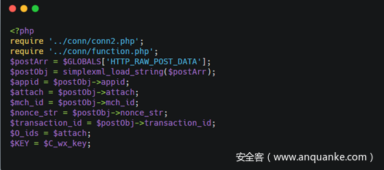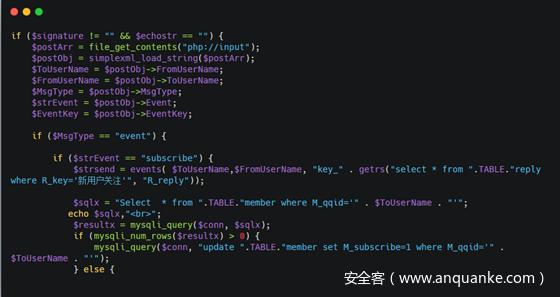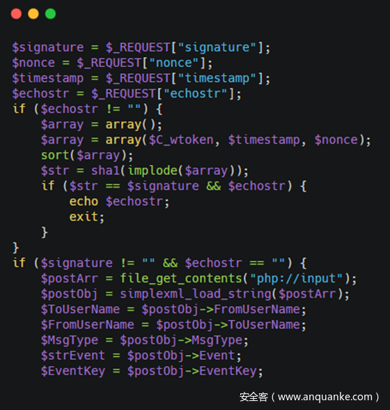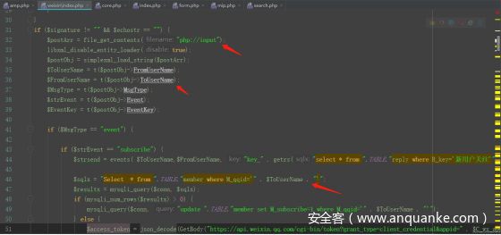 进入存在漏洞的文件之中(weixin/index.php)。关键代码如下: