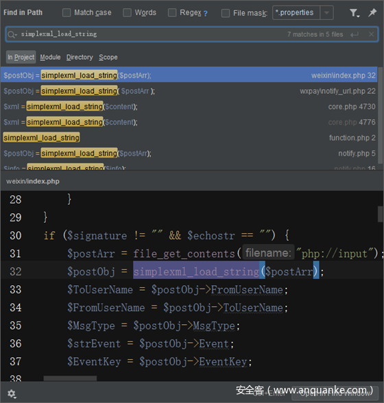 打开源码,全局搜索关键字simplexml就可以发现该漏洞点了。