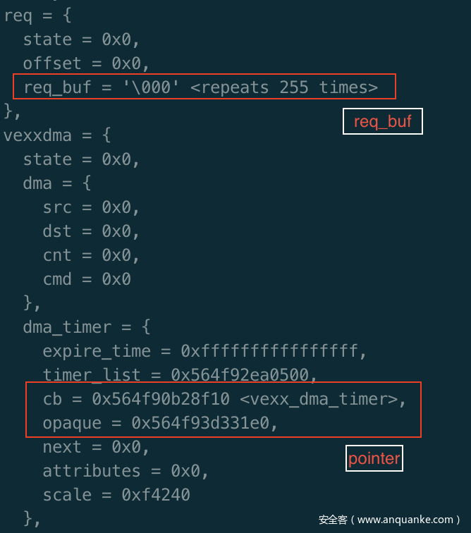 第二部分是泄露。由于程序开了PIE,所以需要泄露地址。可以通过越界读取req.req_buf后面QEMUTimer结构体中的opaque指针来泄露堆地址(opaque指针刚好也是VexxState对应的那个指针),可以通过读写QEMUTimer结构体中的cb指针来泄露程序基址(cb指针对应的是vexx_dma_timer函数的地址),指针如下图所示。