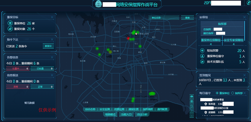 实时监测模块,可以看到各重保目标的实时情况,包括单位角度及威胁角度的告警情况、流量监测情况以及产生了告警的单位。大屏中每一个点,代表一个重保对象,可以通过颜色区分是否处置完毕。在指挥调度模块,可以看到重保期间重保单位数和重保对象数。同时,平台还设置了点名与签到功能,确保责任到人。