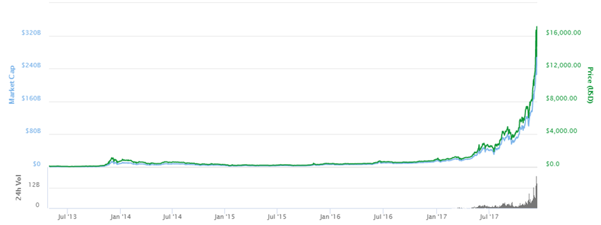 图1 比特币2013年-2017年交易价格变化趋势[1]