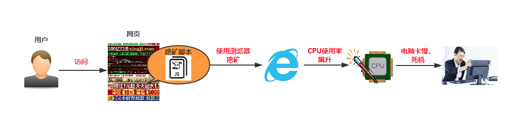 浏览器是用户使用频率最高的应用程序之一。当用户通过浏览器访问一个网页时,用户的浏览器负责解析该网页中的内容、资源和脚本,并将解析的结果展示在用户面前。当用户访问的网页中植入挖矿脚本时,浏览器将解析挖矿脚本的内容并执行挖矿脚本,这将导致浏览器占用大量计算机资源进行挖矿。挖矿脚本的执行会使用户计算机出现卡慢甚至死机的情况,严重影响用户计算机的正常使用。图7描绘了网页挖矿脚本的执行与危害。