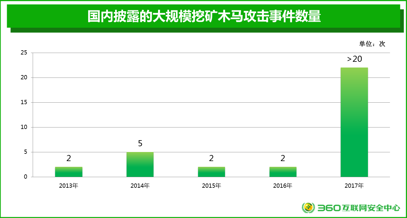 图2 2013年-2017年国内披露的挖矿木马攻击事件数量