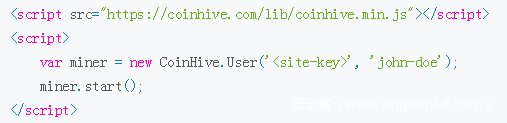 可以看出,Coinhive是不法分子的首选,这也归功于Coinhive使用上的便捷性。入侵网站的黑客或者贪图利益的站长并不需要将挖矿的js代码写入网页中,而是在网页中调用Coinhive官网中的js文件coinhive.min.js并指定一个唯一的标识符即可。图9展示了Coinhive的代码范例。