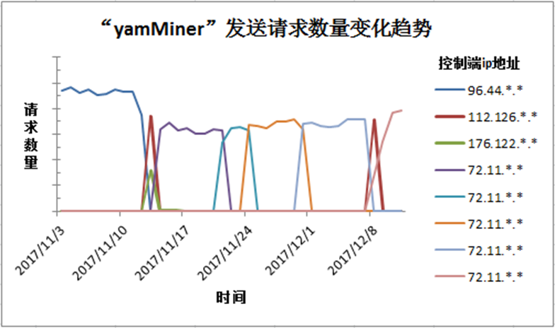 图23 “yamMiner”僵尸网络傀儡机向控制端ip发送请求的数量变化情况