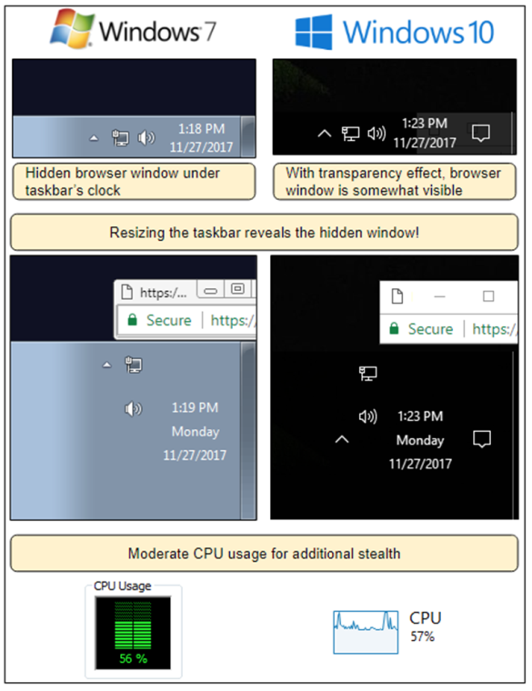 由于网页挖矿脚本执行时会导致浏览器CPU占用率过高,计算机运行卡慢等情况,这会引起浏览器用户的注意。一些挖矿脚本为了不引起用户的注意使用了一些手法隐蔽网页挖矿脚本的运行。